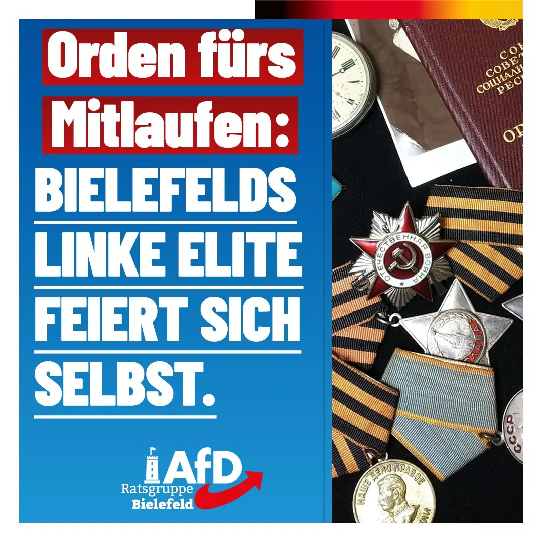 Dr. Florian Sander, Vorsitzender der AfD-Ratsgruppe Bielefeld, kommentiert: „Gerade in heutigen Zeiten brauchen wir Wissenschaft, die Fragen stellt, statt politische Antworten zu liefern. Aber stattdessen erleben wir eine neue Form der Staatsmoral, in der sich die immer gleichen Eliten gegenseitig bestätigen und dafür noch ausgezeichnet werden. Wir als Ratsgruppe fordern mehr Transparenz bei staatlichen Ehrungen und eine Rückbesinnung auf das, was Auszeichnungen gegenüber Wissenschaftlern und Medienschaffenden einmal ehren sollten: Leistung, Unabhängigkeit, kritisches Bewusstsein und Verantwortung gegenüber der ganzen Gesellschaft – nicht nur gegenüber einer bestimmten politischen Richtung.“