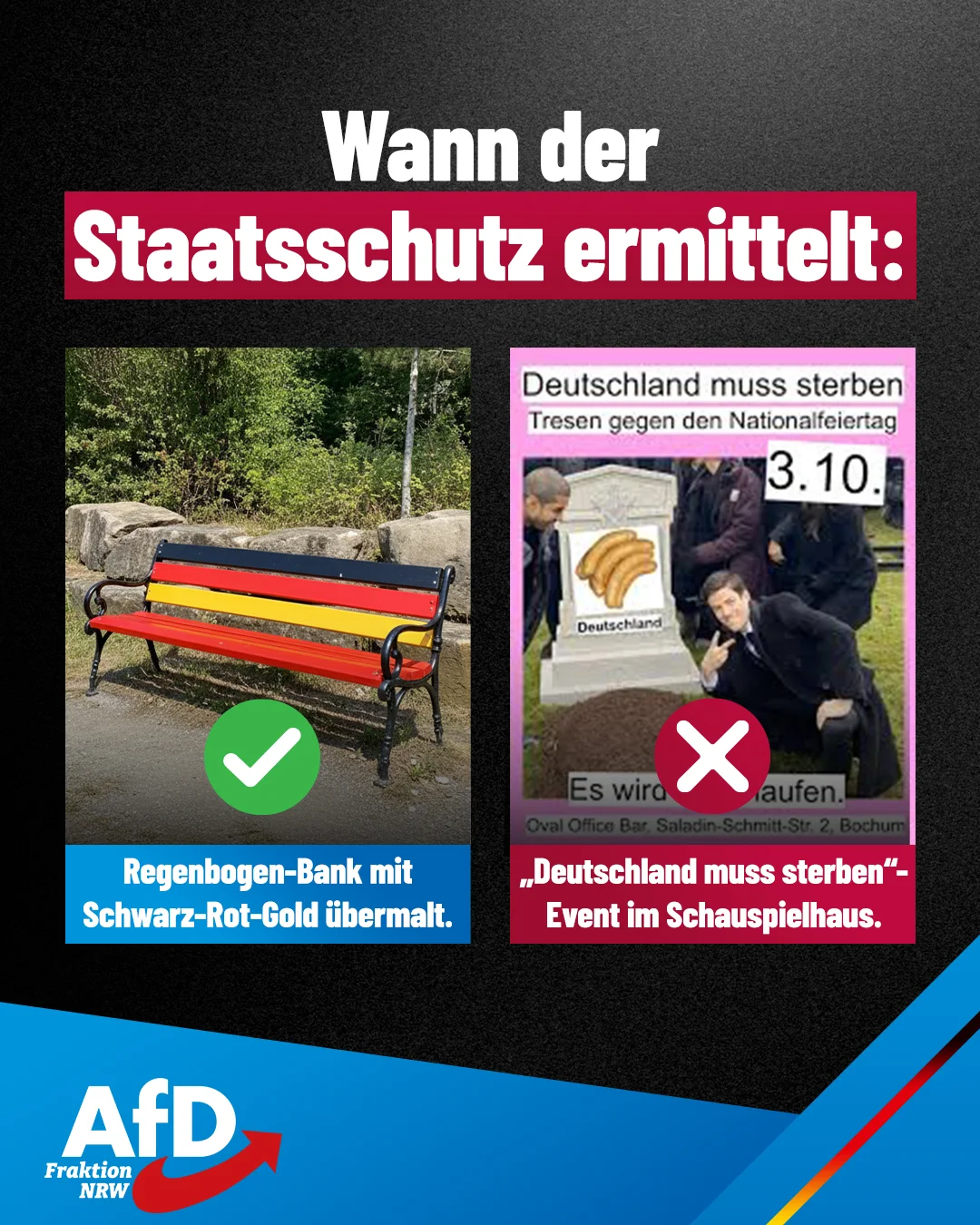 „Im Düsseldorfer Rheinpark wurde eine regenbogenfarbene Sitzbank mit der Deutschlandfahne überstrichen. Dies löste zügig Ermittlungen des Staatsschutzes aus, da die etablierten Fraktionen Hass, Ausgrenzung und Zerstörung witterten.